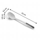 Заокруглені краї робочої частини забезпечують зручне користування навіть у кутах посуду, а поздовжній отвір у ручці зменшує вагу, підвищує комфорт під час роботи та дає змогу підвішувати ложку на гачок.
