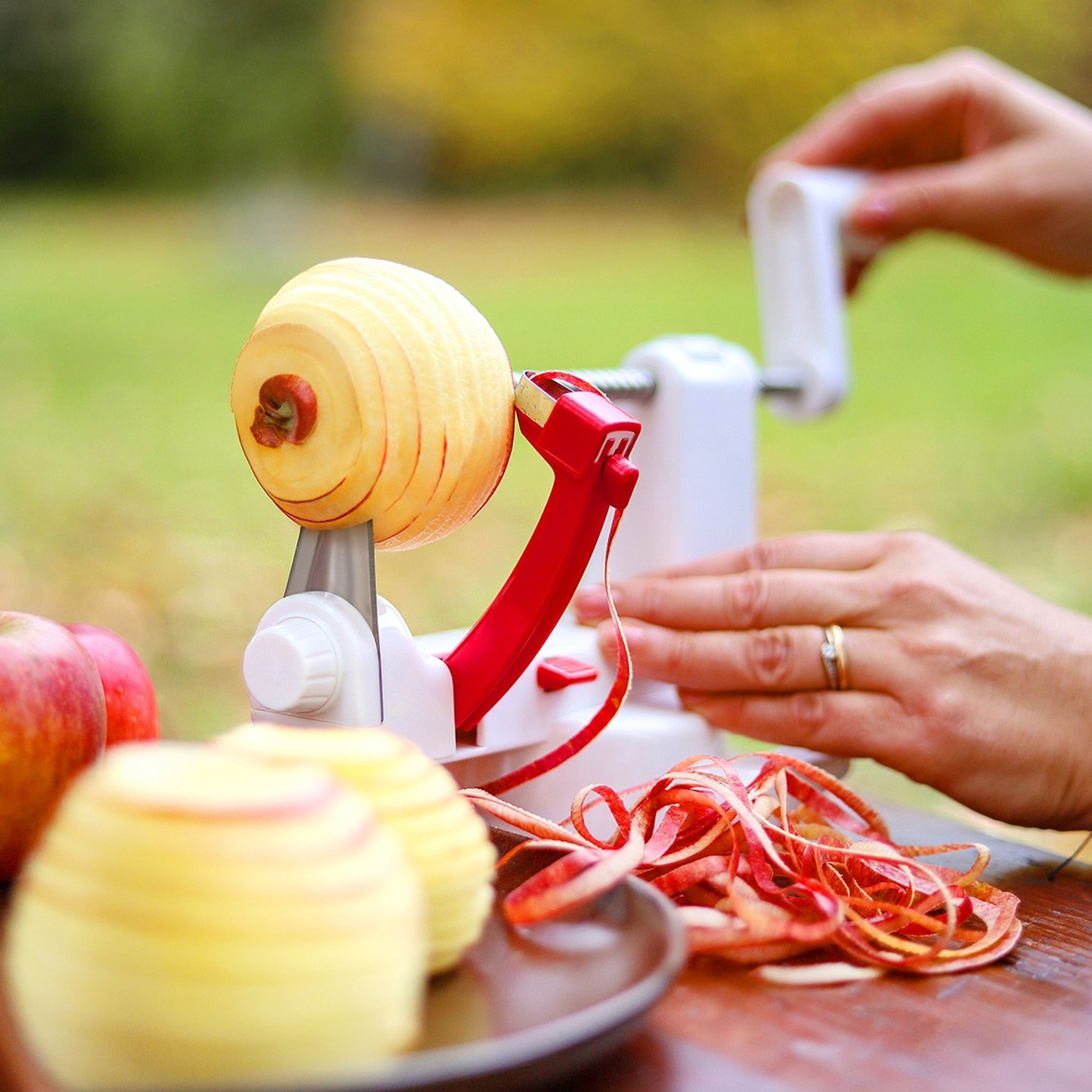 Очищувач і ніж для яблук HANDY — незамінний помічник під час приготування яблук для сушіння, випічки чи компотів. Він одночасно очищує плоди від шкірки, нарізає їх на рівномірні скибочки та видаляє серцевину, економлячи ваш час і зусилля.